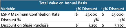 To illustrate, in 2022, the maximum amount you can contribute into an ESPP is $25,000. The table below show’s what the discount would look like on a dollar basis if your plan had a 5% and 15% discount.