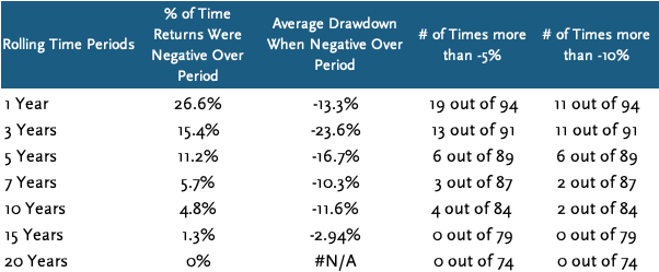 So, when we look at the data, when do the odds begin to favor investors? How about seven years? Over every seven-year period since 1928, about 95% of the time, you were better off being an investor than not. There is also a significant improvement between the 5-year and 7-year periods, where the percentage of time periods when returns were negative dropped from 11.2% to 5.7%. This is a substantial change, where the percentage of the time you would have been worse off, gets cut in half from about a one in ten possibility, to about a one in twenty.