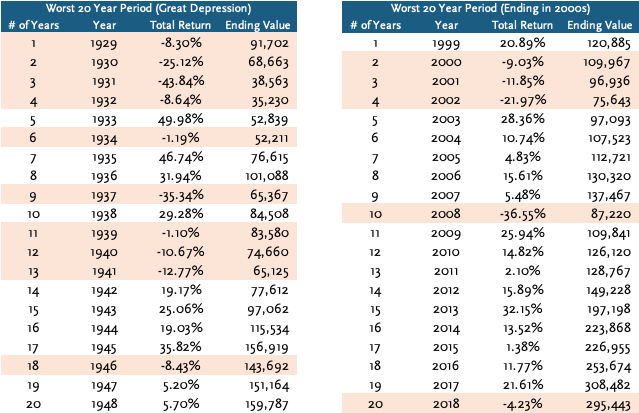 Here’s what it would’ve looked like if you invested during the Great Depression and during the worst 20-year period in the 2000’s, which included the Dot-Com bubble and Great Recession. Years with negative returns are highlighted in red.