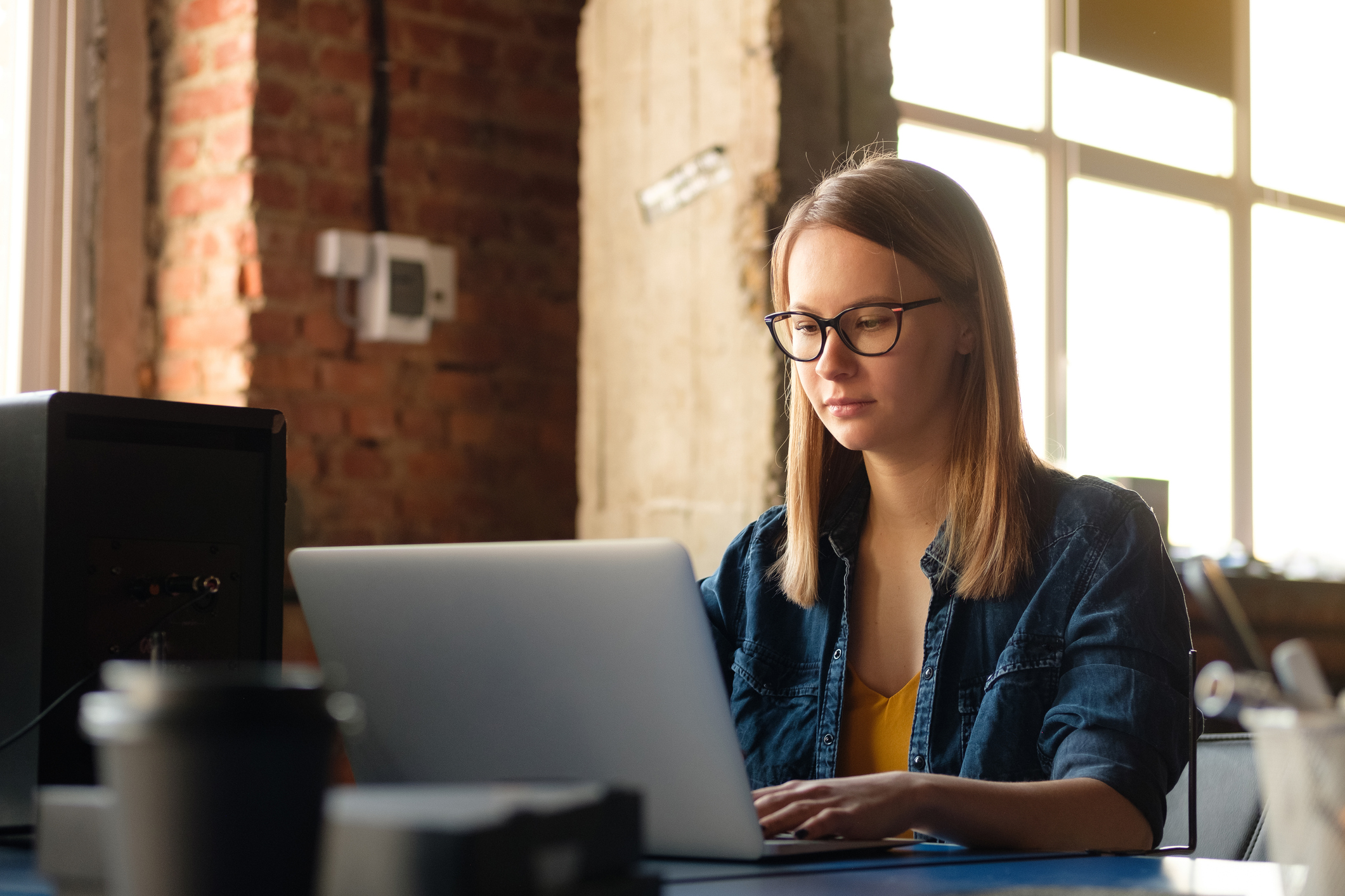 A girl works at a computer in a modern office