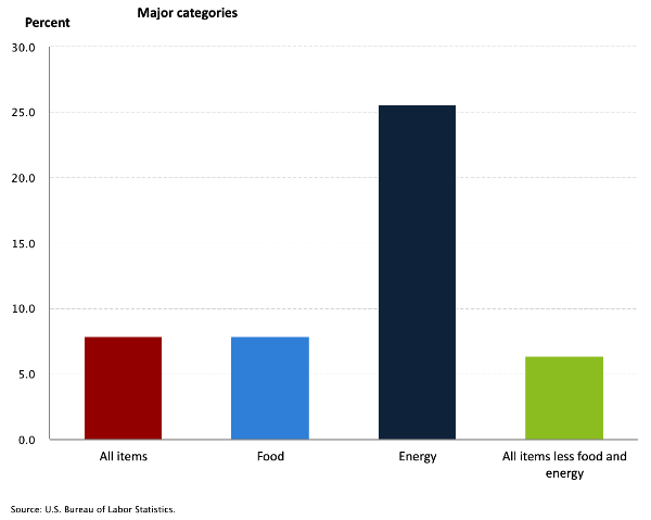 Below is a breakdown of the year over year % increase in the Consumer Price Index (CPI), the primary inflation indicator. As of February, we can see significant increases in the primary categories of food and energy, with energy experiencing the biggest increase.