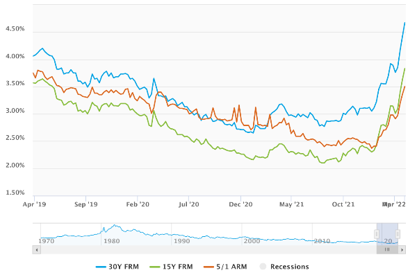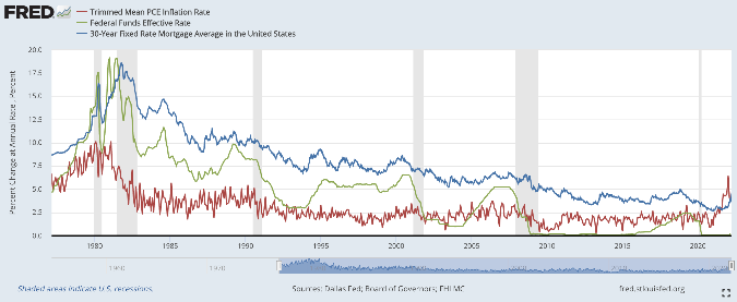 Below is a chart comparing inflation, the Federal Funds rate and 30 year mortgage rates. You can see the correlation between rising inflation and the delayed effect of increased borrowing costs, due to the increase in the fed funds rate.