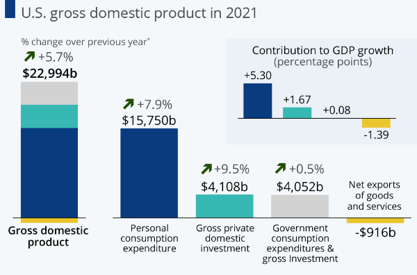 Increasing inflation and the ensuing increase in interest rates will have economic consequences, generally in the form of lower consumer spending. As a reminder, consumer spending (identified below as “Personal consumption expenditure”) is the primary driver of US economic growth, representing almost 70% of GDP, as the following graph illustrates: