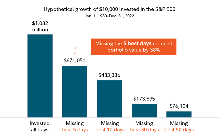 - Why it’s hard: if you only missed the 5 best days to be invested, you missed out on $411k.