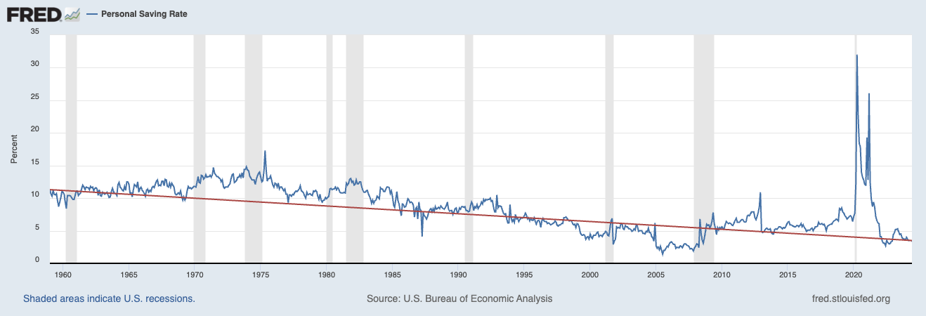 A common rule of thumb is to try to save at least 20% of your income. However, when we look at our country’s personal savings rates, we’re nowhere close to that goal. As of June 2024, the personal savings rate was just 3.4%. Meaning, after taxes and personal spending, only 3.4% of Americans’ incomes were saved. In fact, the only time personal savings rates were above 20% was in the midst of the covid pandemic (not much explaining needed there).