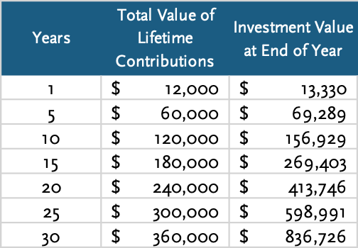 You can see that over time, the value of their investments grew substantially in the later years. $360,000 worth of contributions, grows to $836,726 in asset value, in which a majority of the portfolio is comprised of investment returns versus lifetime contributions. The table above shows the power of starting a good habit sooner rather than later.