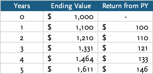 It works like this… imagine you invested $1,000 and earned a 10% return on your investment in the first year, the next year, and in the years after that. In the first year, your $1,000 would earn $100, but in the second year it would earn $110. That’s because in the next year, the $100 of earnings will also grow by 10% ($1100 x 10%) and this happens year after year after year.